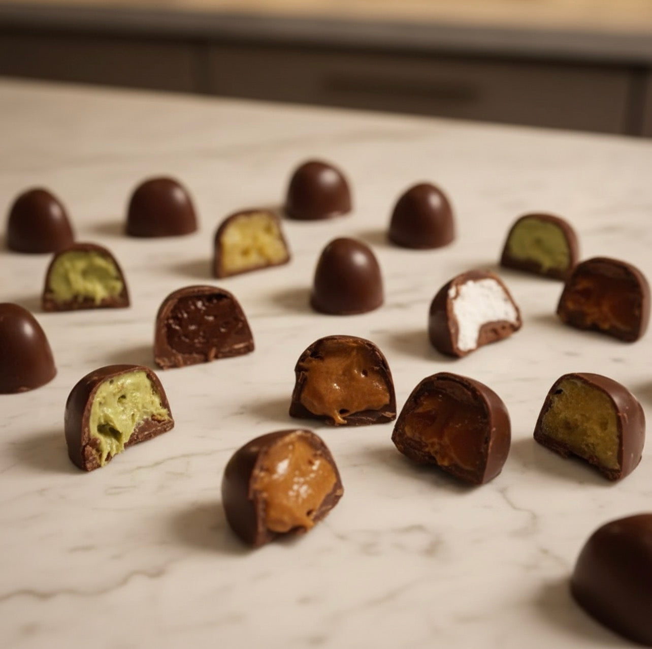 Bombons finos com técnica artesanal, chocolate belga 100% manteiga de cacau e ingredientes selecionados.