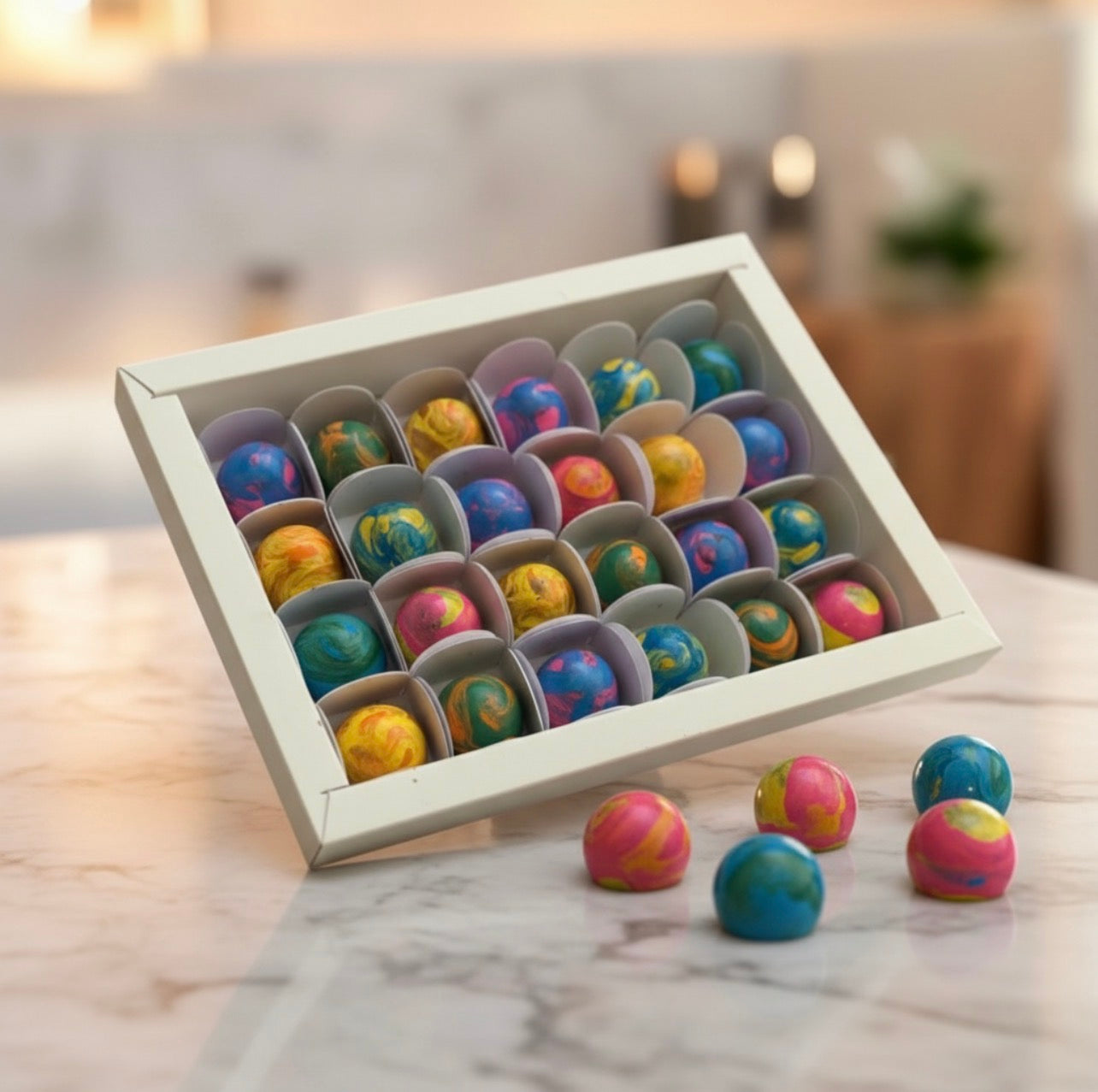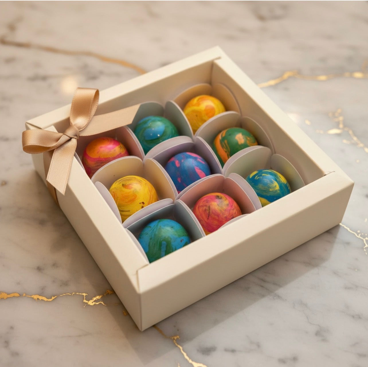 Bombons de chocolate belga pintados à mão com várias opções de recheios exclusivos.