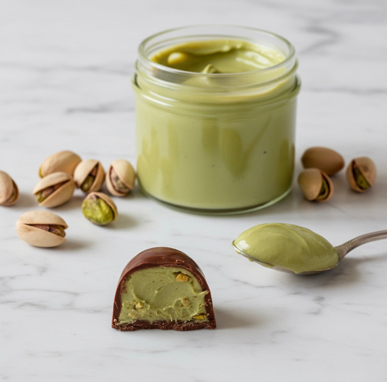 Casquinha de chocolate ao leite, creme de pistache aveludado envolto em finos fios crocantes de kadayıf.
