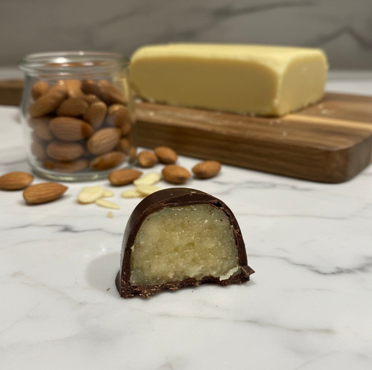 Casquinha de chocolate meio amargo recheada com nosso exclusivo marzipan de amêndoas, suave e cremoso.